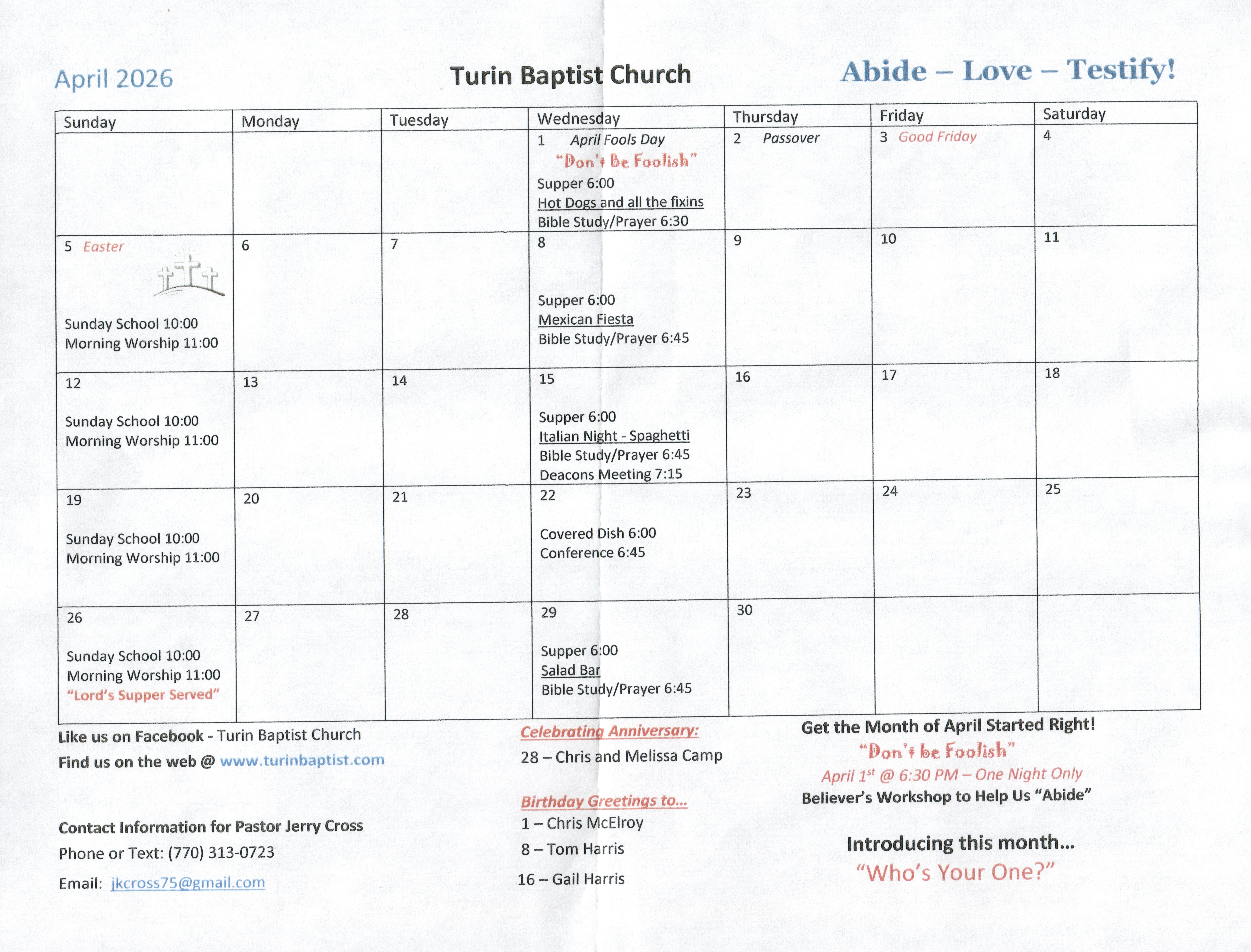 Turin Baptist is located at 29 Church Street in Turin, Georgia.