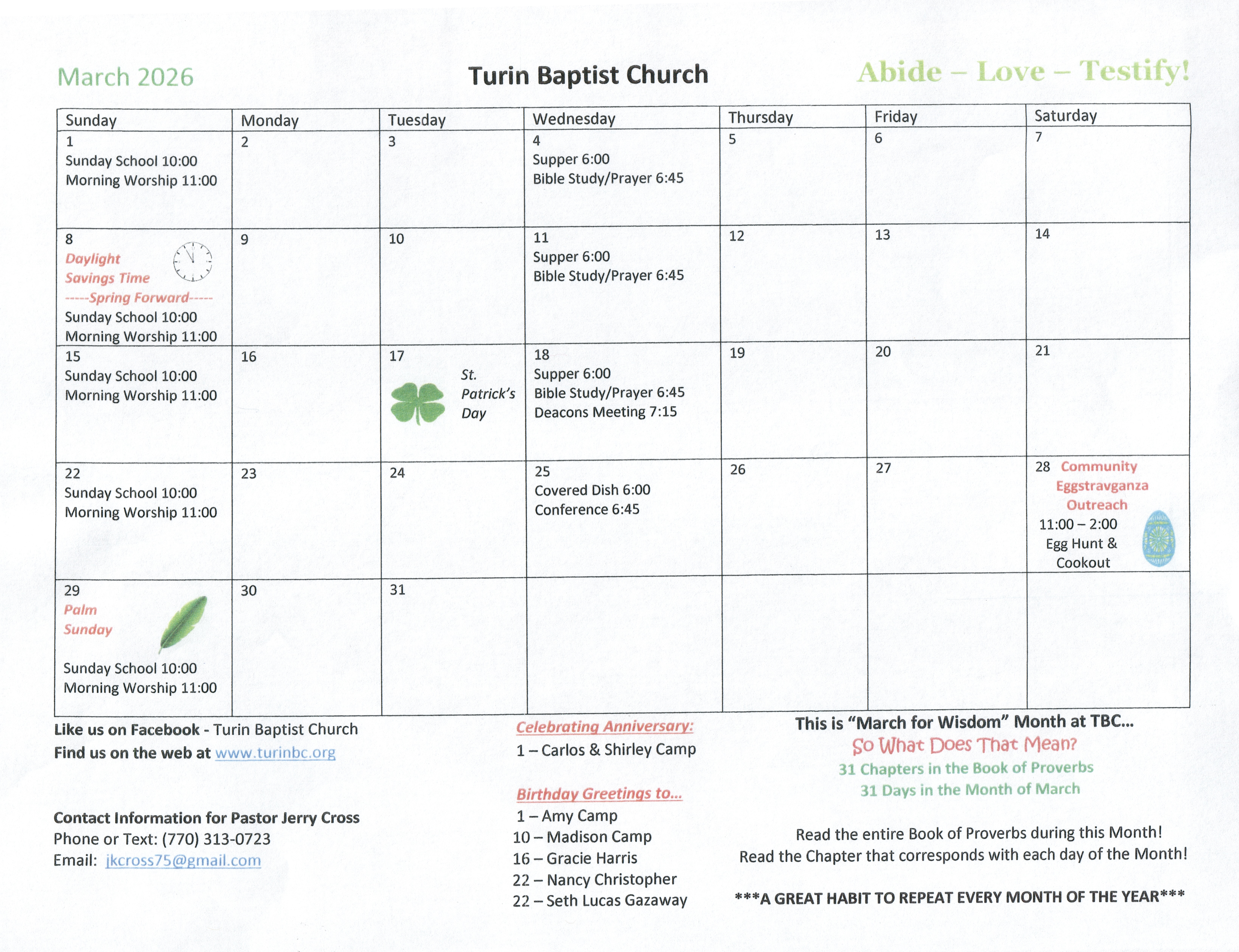 Turin Baptist is located at 29 Church Street in Turin, Georgia.